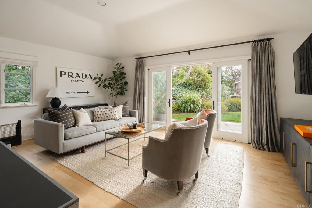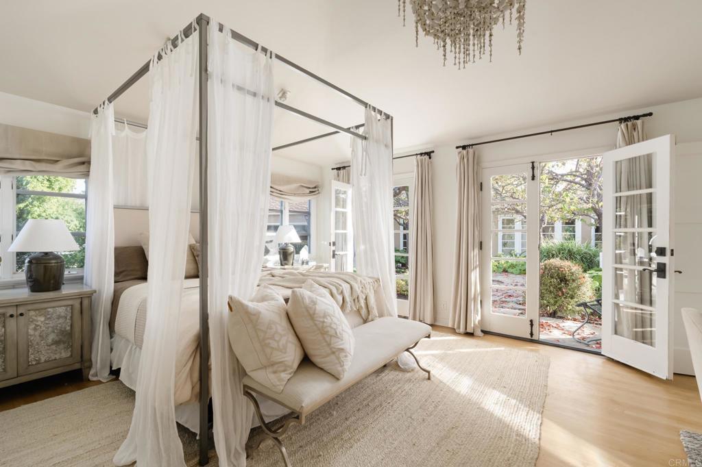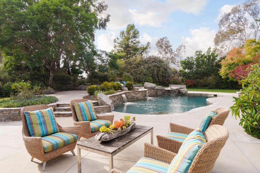Ideally located on one of the most sought-after streets in the renowned Rancho Santa Fe Covenant, with views of amazing sunsets and RSF golf course, is this enchanting single-level home seamlessly combines charm, sophistication, and functionality. Your private oasis awaits with an expansive backyard that borders acres of open space, impeccably groomed trails, and just a short walk to the Rancho Santa Fe Village, the acclaimed Roger Rowe Elementary and Middle schools and the Rancho Santa Fe Golf and Tennis clubs. You will immediately fall in love with the beauty of the lush landscape and the inviting private courtyard entry. The home boasts a freshly remodeled kitchen, and exquisite reclaimed maple floors throughout. It has a sun-drenched great room, and a gourmet eat-in kitchen, that seamlessly open onto the pool and entertaining areas with westerly views and gentle ocean breezes. The interior design includes 5 bedrooms, 4.5 baths and floor-to-ceiling windows and French doors that seamlessly caters to the indoor/outdoor living you can enjoy year-round in San Diego.
